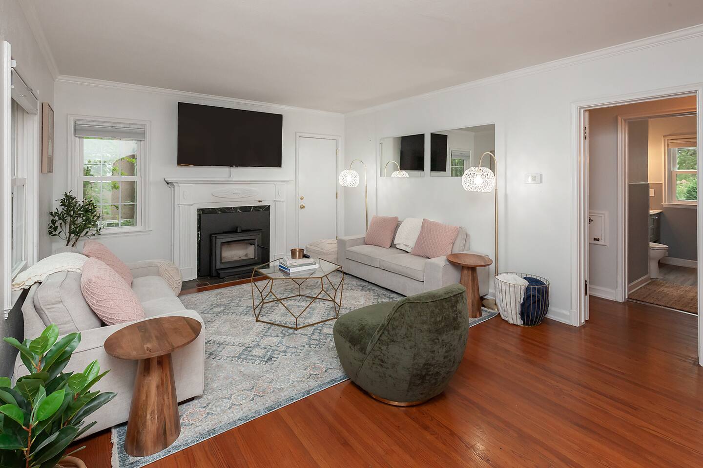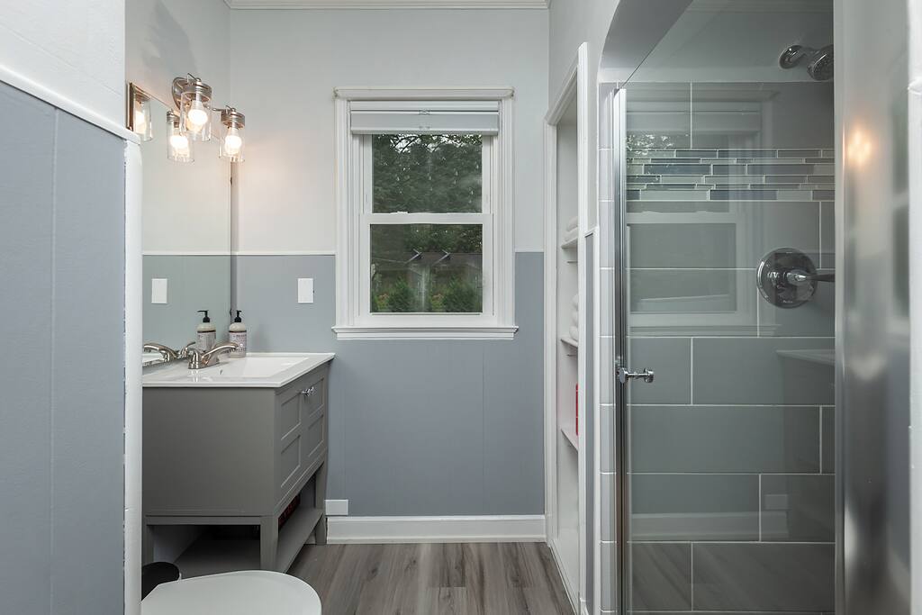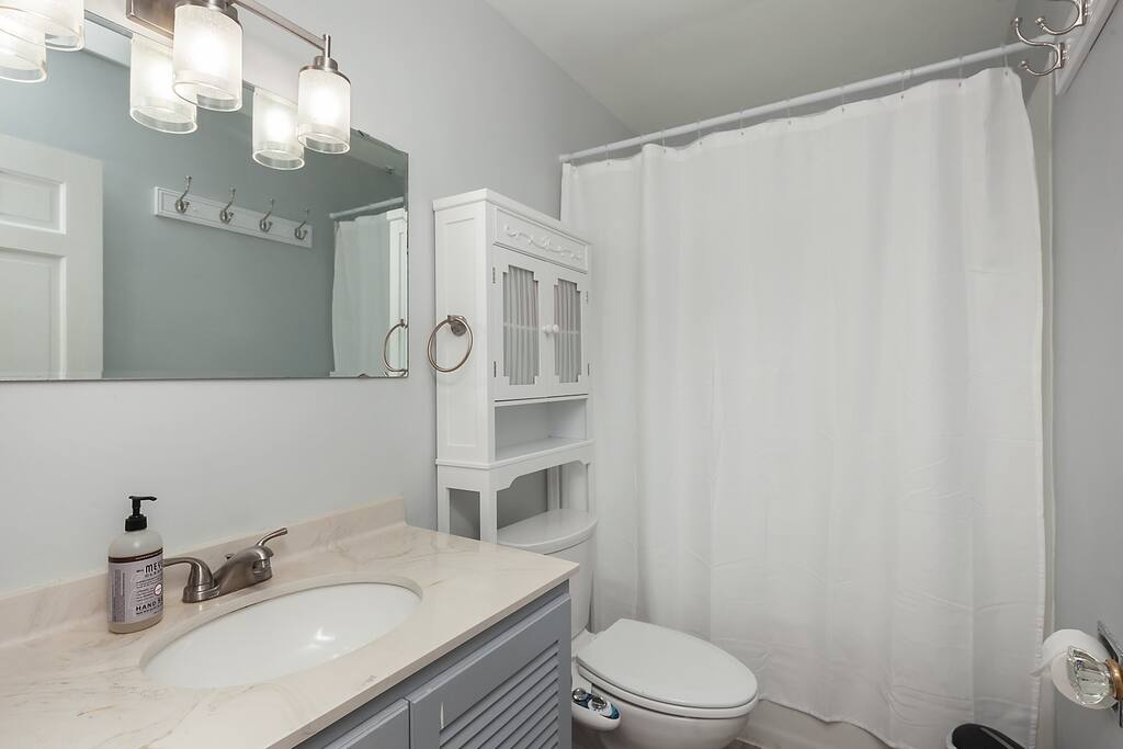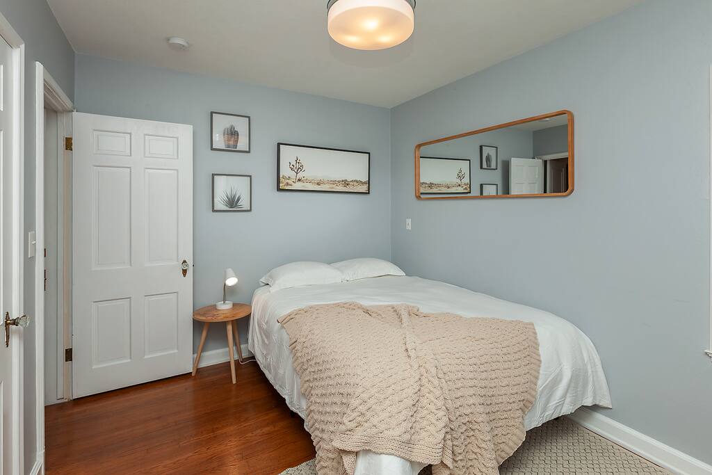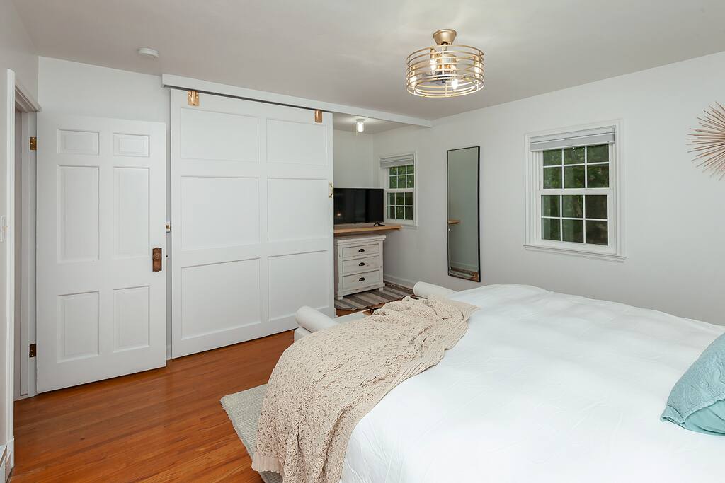 Queen room on the main level. King, queen, full/double, and trundle bed (two twin beds) upstairs. The mattresses are comfortable and so is the bedding!! We know how important that is. One bathroom on the main level and one upstairs. No ensuite bathrooms.